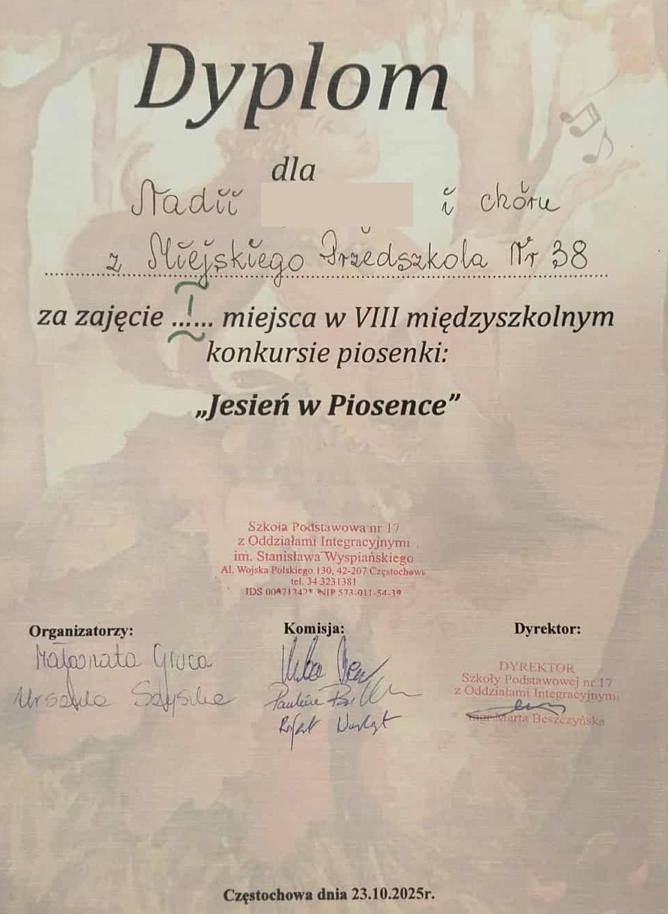 Miło nam poinformować, że reprezentanci z grupy Tygrysy zajęli I miejsce w VIII Międzyszkolnym Konkursie Piosenki „Jesień w piosence” zorganizowanym w Szkole Podstawowej nr 17 w Częstochowie. Gratulujemy!